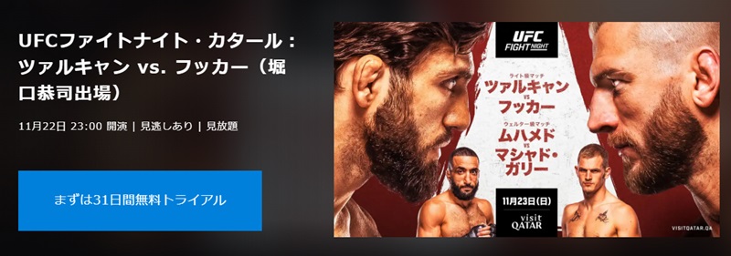 11月23日の「UFCファイトナイト・カタール:堀口恭司 vs. ウランベコフ」はU-NEXTで視聴可能です。(※地上波テレビ放送無し)